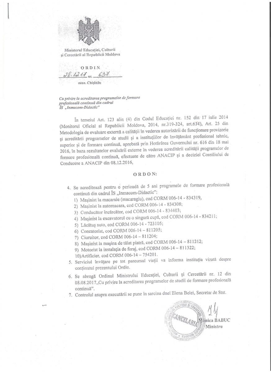 Ordin cu privire la acreditarea programelor de formare profesională continuă nr. 637 din 28.12.2017